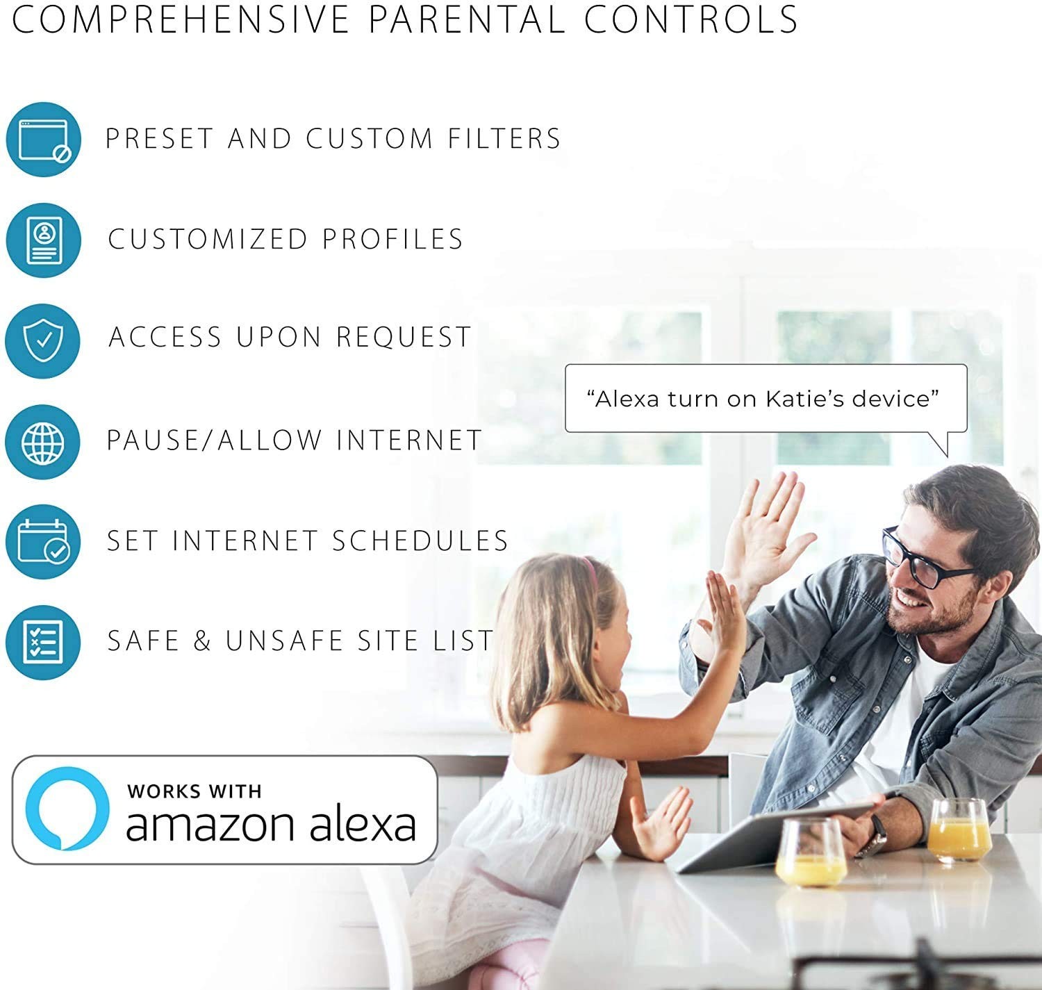 • Pause the internet: pause the internet for a single family member or the whole family with a single tap or just ask Alexa